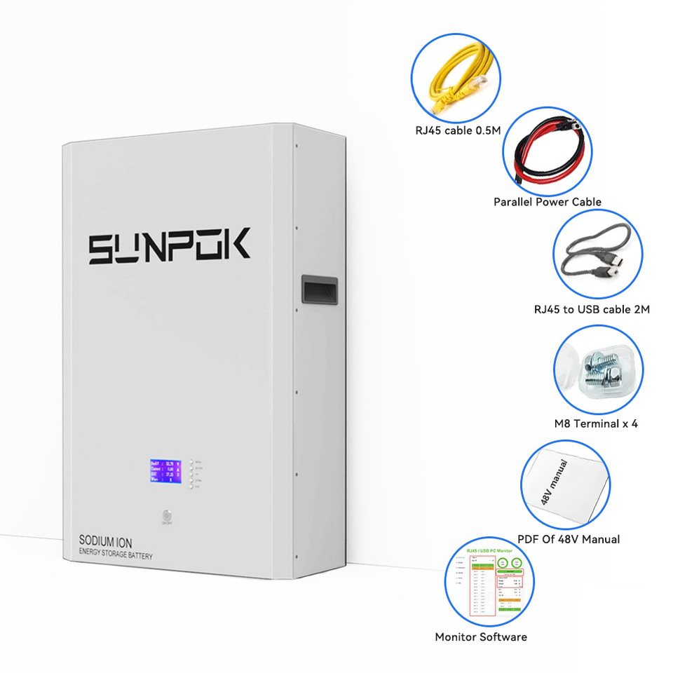 توفر بطارية الصوديوم (المعروفة أيضًا باسم بطارية الصوديوم أو بطارية Na Ion) من Sunpok Energy سلامة عالية ووقت شحن سريع وقدرة عالية. وهي معتمدة مع MSDS ، UN38.3، ROHS ، IEC62619 ، و CE ، ولها جهد اسمي 48V / 51.2V.